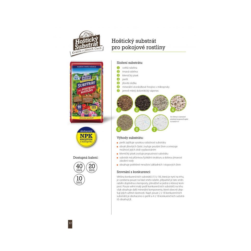 HOŠTICKÝ SUBSTRÁT PRO POKOJOVÉ ROSTLINY je vyroben ze směsi vytříděné světlé a tmavé rašeliny, prosetého jemně tříděného křemičitého písku, perlitu, přírodní jílovité složky a minerálního vícesložkového hnojiva s mikroprvky. Půdní reakce je upravena jemně mletým dolomitickým vápencem.